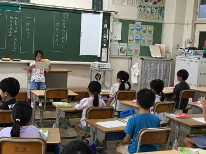 時間割通りの授業も始まり、国語の「はなしたいな ききたいな」の単元では、夏休みの思い出について発表会をしました。音楽の「みのまわりのおとにみみをすまそう」の単元では、教室の中で目を閉じて耳を澄ましてみたり、外に出てどんな音が聞こえるか探してみたりしました。