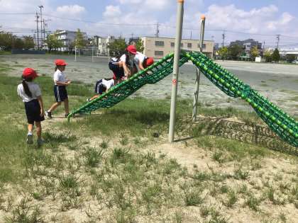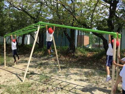 体育の授業で、体を慣らす運動として遊具遊びを行いました。暑い中でしたが、子どもたちは水分補給をしながら安全に楽しく活動することができました。