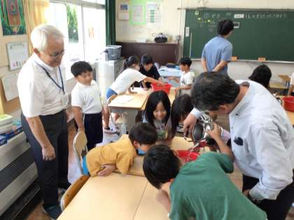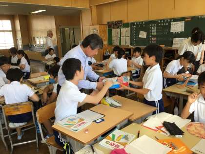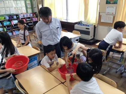 教育長が子どもたちの様子を見に来校されました。今回は2年4組と6年1組の授業を参観されました。2年4組では、1リットルを予想してやかんに水を汲み、ビーカーにうつすゲームをしていました。少し足りなかったり、あふれてしまったりする子もいる中、教育長もゲームに参加され、子どもたちととても楽しそうにされていました。6年1組ではピザを8等分する算数の授業で、ここでも子どもたちとの交流を楽しまれていました。