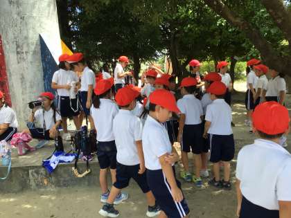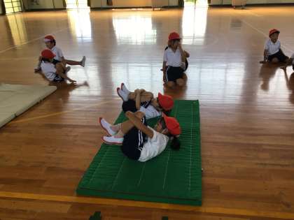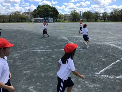 2年生と1年生の体育の様子です。体育館は冷風機を使いながら行っています。運動場はこまめに休憩をとり、水分も補給しています。