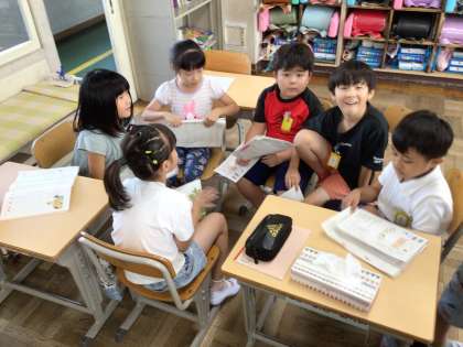 1枚目は、国語「みんなで話し合おう」のグループ分けをした様子です。好きなお話の世界でどんなことをしたいかを、質問や、相槌をうったり繰り返したりして話をつないでいく勉強です。教科書とは違う質問ができる子も増えました。