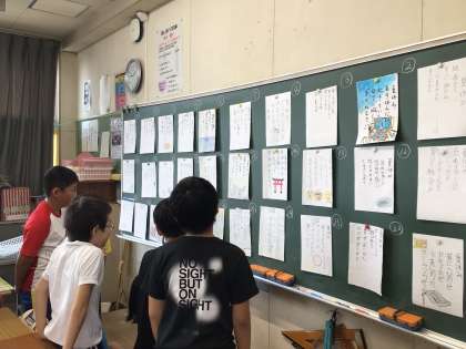 国語科の「心の動きを短歌で表そう」の学習では、「夏休み」という言葉を使って短歌を作りました。完成後に歌会を開き、お気に入りの短歌を選んで感想を伝え合いました。