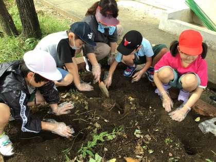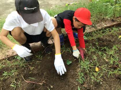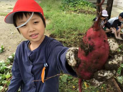学校の畑で育てていたサツマイモが大きく育ってきたので、クラスごとに芋掘りをしました。顔ぐらいの大きさのサツマイモを掘り出すと、びっくりした様子で喜び、楽しく活動することができました。