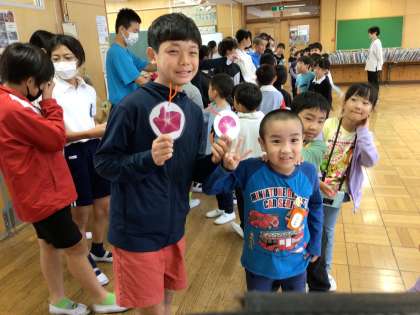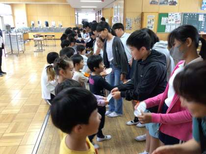 昨日、修学旅行に出発する6年生に、1年生が素敵なプレゼントを渡しました。日頃掃除を一緒に手伝ってくれたり、フレンドリータイムで一緒に遊んでくれたりしてお世話になっている6年生が楽しく修学旅行に行ってこられるよう、育てたアサガオの押し花の裏にメッセージが書いてありました。6年生もとても嬉しそうでした。