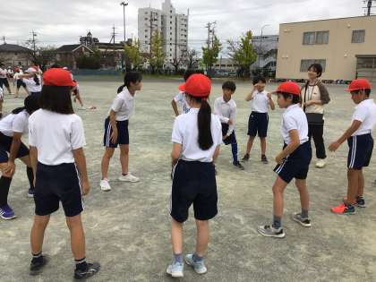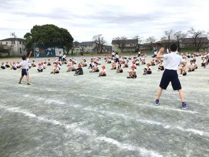 5、6年生がソーランの練習をしていました。6年生が5年生に教える形で練習を進めていました。グループで練習していると、「難しい!」「できるかも!」「こうやるのか」などの声が聞かれ、5年生も真剣に覚えていました。