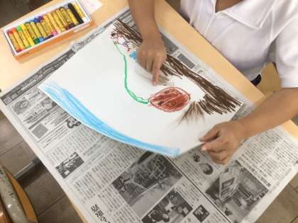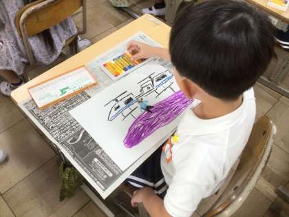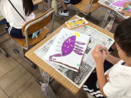 図画工作科「おはなしだいすき」の学習で、「おおきな おおきな おいも」のお話から広がる世界を絵にしています。お話を聞いて、自分の好きな場面や、印象に残ったことを話す内に、どんどん描きたい気持ちが膨らんでいきました。友達同士で手を繋ぎ、「こんなに大きいおいもだと思うよ」と話したり、おいもが「むくっ」と大きくなる様子を体を大きく使って表現したり、とても楽しそうです。