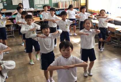 雨の日は、教室や体育館でダンスの細かい部分を確認します。晴れた日は、運動場で大きく踊る練習をしています。子どもたちは、音楽が流れると自然に体が動き、楽しそうに踊っています。