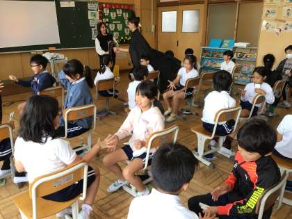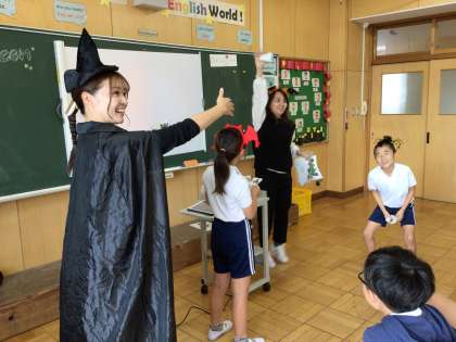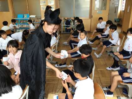 3年生の外国語活動では、英語ルームでハロウィンの授業をしていました。いろいろな子とペアになり、同じフレーズを何度も言うことで、楽しみながら英語に慣れ親しんでいました。