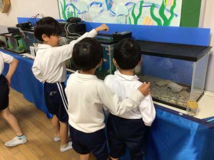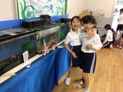 今日も生き物広場は大賑わいです。カブトムシの幼虫からザリガニ、カメ、魚に至っては、グッピーをはじめ、たくさんの種類のかわいい魚がいて、みんなで成長を見守っています。今日はザリガニの卵を見つけた子がいました。そんな中、3匹のカメの名前が、子どもたちの出した候補の中から環境委員会の児童の投票で決まりました。緑色の小さな子が「ミント」緑色の大きめの子が「三日月」、茶色の子が「きなこ」です。選ばれた子たちには、えさやりチケットが後日環境委員さんからもらえるそうです。名前がついたことでさらに愛着が湧きそうですね。