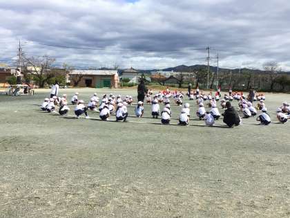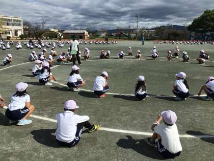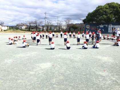 1、2年生の玉入れの練習の様子です。今日はカゴや玉を使わず流れの確認をしていました。