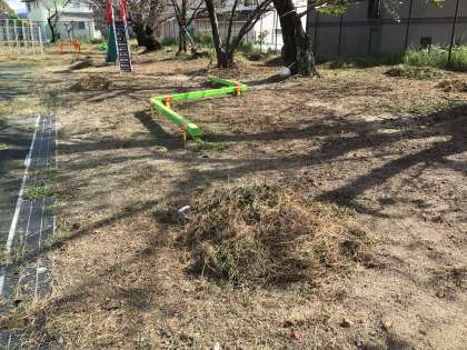 今年度の運動会は、運動場の南側も観覧場所として開放します。保護者の皆様にきれいな環境で観覧していただけるよう、運動場の南側の草取りをシルバー人材センターの方にしていただきました。写真は昼前の様子ですが、すでにかなりの範囲がきれいに刈られていました。午後は不在にしていたため、最後まで見届けることはできませんでしたが、遊具や倉庫の辺りまで終日作業してくださいました。とてもありがたいです。