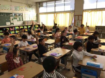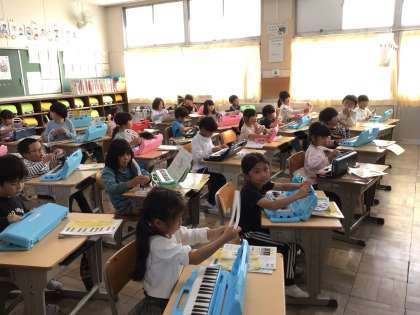 運動会が終わりましたが、子どもたちはしっかりと切り替えて、学習に取り組んでいます。1年生は運動会で一番心に残ったことを振り返ってワークシートに書くところでした。他には算数の「かたちづくり」で算数セットの形のマグネットを使って色々な形を作っていたり、音楽の授業で鍵盤ハーモニカを吹いている学級もありました。