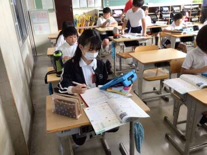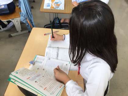 4年生の様子です。国語の「くらしの中の和と洋」の学習で、和室と洋室のよさを紹介するためにホワイトボードに言葉を書き出し、ワークシートにまとめていました。別の学級では、算数の授業で概数について学習し、学習用タブレットも使いながら、ノートに問題を解いていました。