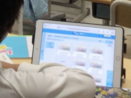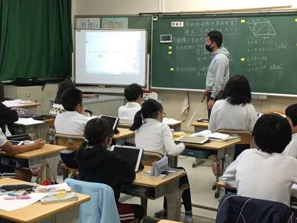 5年生の別の学級では、算数の授業で平行四辺形の面積の求め方を各自で考え、学習用タブレットで共有していました。その後、教科書の問題をノートに解いていました。