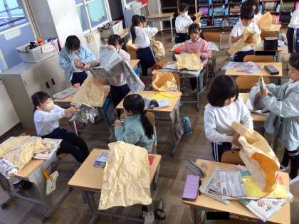 図工「くしゃくしゃぎゅっ」では、紙袋と新聞紙を丸めたりねじったりしながら作品づくりをしました。思い思いの丸め方を工夫しながら、紙の触り心地の変化を楽しむことができました。