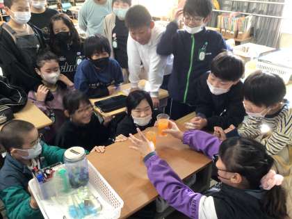 算数科の「平均とその利用」の学習では、3つのコップに入った量の違うジュースをならすにはどうしたらよいか考えました。量の多いコップから少ないコップに移す方法や、全てのジュースをバケツに入れてから平等に分ける方法などが意見として出ました。平均は、数量の合計を個数でわれば求められることを体感することができました。