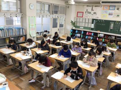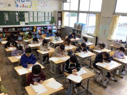 新年初登校の今日は、書き初め大会が行われました。2時間集中して取り組む子どもたちの姿に、とても清々しい気持ちになりました。12月の頃よりも丁寧に書けるようになった子がたくさんいて、冬休みに頑張って練習した様子がうかがえました。