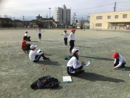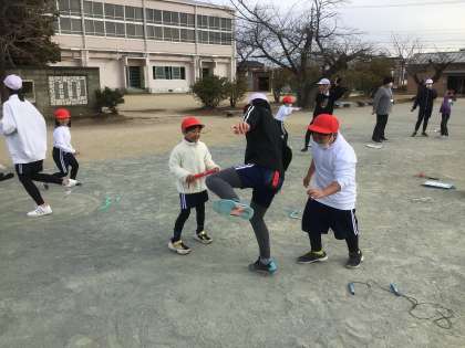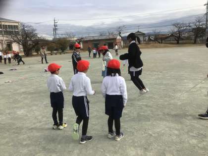 今日、1年生はフレンドリーでペアを組んでいる6年生と縄跳び記録会をしました。記録会の前に、ウォーミングアップとして尻尾取りをしました。6年生は、両手を挙げて片足で逃げるハンデがありましたが、1年生の中には、一生懸命追いかけても追いつけない子もいました。記録会では、6年生が1年生を優しく励ます姿が見られました。6年生と過ごす時間もあとわずか。楽しい思い出を作ることができました。