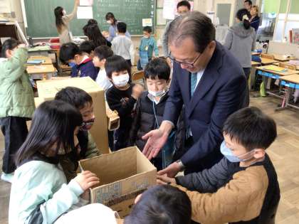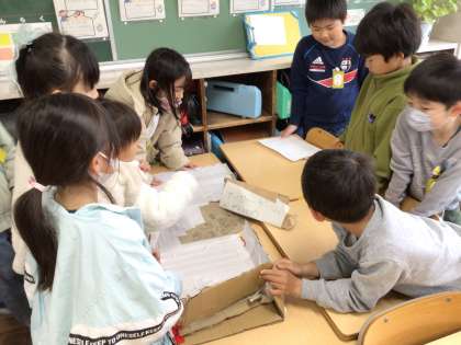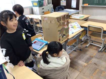 2年生は、1年生を招待して行う「おもちゃまつり」の準備をしていました。以前学区探検で豊栄地区に行った子たちにお話を聞かせてくださった副区長の杉坂様も、参観にいらしてくださいました。子どもたちと一緒におもちゃで遊んでくださり、子どもたちの成長を喜んでくださいました。