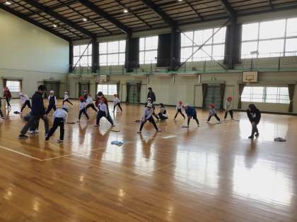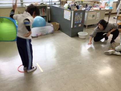オアシスさんは体育館で体育の授業を行っていました。保護者の方に見守られながら、先生の号令に合わせ動きをそろえて準備体操を行っていました。また別の時間には、学習用タブレットで学習する姿や、担任が投げた輪っかに乗ることで、瞬発力を鍛える活動をしている様子も見られました。