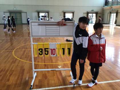 体育の学習でソフトバレーをしました。ボールを落とすまいと必死に動く姿が見られました。写真は点差がついても仲間を信じる子たちです。試合結果は...完敗でした。