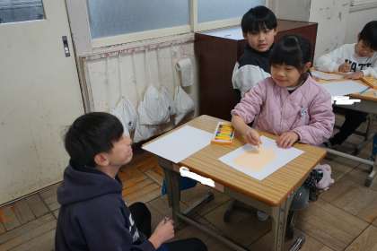 2枚目の写真は1年生との交流の様子です。1年生が6年生に似顔絵をプレゼントしてくれるそうです。照れながらモデルになる6年生が見れました。6年生からもお返しで似顔絵を描きました。喜んでくれたらうれしいですね。