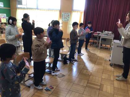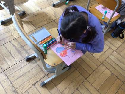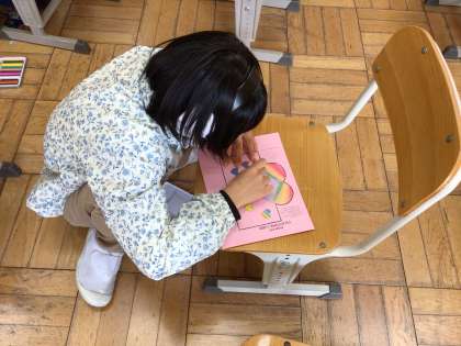 2月14日は英語の時間に、好きな色についての学習をした後、バレンタインカードを作りました。レッドやピンク、レインボーなど、学習した言葉を声に出したり、ハートの模様を工夫したりしながら、みんな思い思いに作業しました。