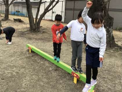 今週から始まった委員会企画の体力アップビンゴに取り組んでいます。平均台から落ちないよう慎重に渡っていました。