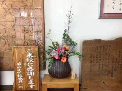 昨夜の雷雨で散ってしまうのではないかと心配していた校庭の桜も、まだきれいな桃色を残しています。玄関には前小サポーターとしてもいつもお力を貸してくださっている狩野様が、卒業式に続き、春の花々をきれいに生けてくださいました。各教室に置くかわいい花も作ってくださり、明日、新入生を迎えます。職員室前の廊下には、地域コーディネーターの栗本さんがご自宅から持ってきてくださった花がきれいに飾られています。正門付近にも公務手の越智さんが丁寧に育ててくださっている花々が咲き誇っています。ご来校の際はぜひご覧ください。