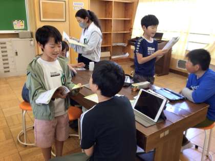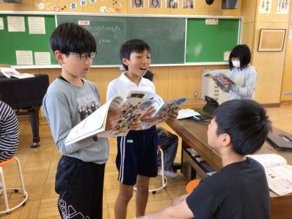 音楽科「歌声をひびかせて心をつなげよう」の学習では、「ペガサス」という歌を歌いました。明るく響きのある声で歌うために、表情や息の吸い方などを工夫して歌いました。ペアで歌声を聴き、アドバイスをし合いました。