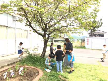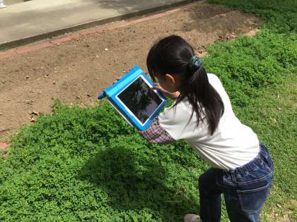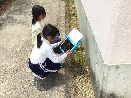 2年生が図工の授業で絵を描くために、学習用タブレットで春を探して写真を撮っていました。見過ごしてしまいそうな小さな花を見つけたり、大きな木を見上げてみたり、とても楽しそうに活動していました。