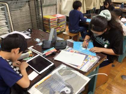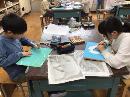 5年生が図工の授業で多色版画をしていました。彫刻刀で掘っている子やインクをつけて刷っている子それぞれでしたが、どの子も一生懸命に、でも楽しみながら活動していました。