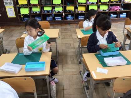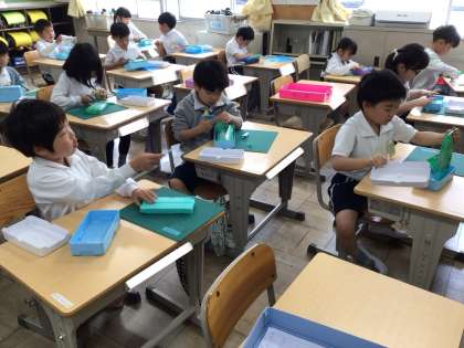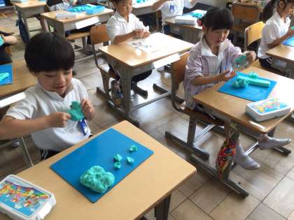 1年生全クラスが、図工で粘土の授業を行っていました。ビニール袋から出した新しい粘土で、小さくちぎったり、筒のようなものを作ったり、団子のように丸めたりしていました。