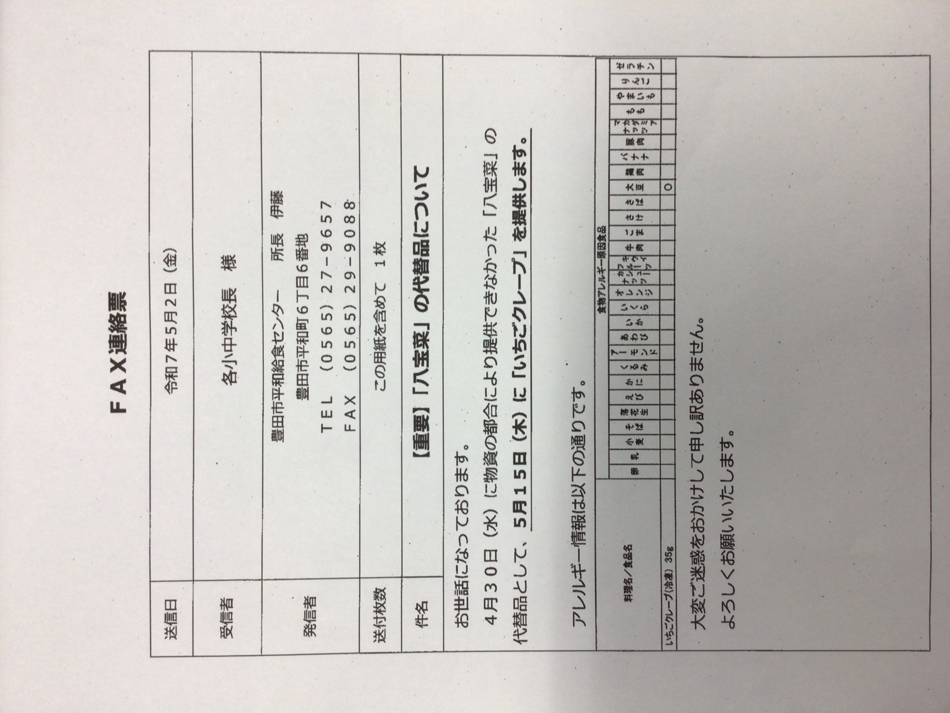 4月30日(水)に物資の都合により提供できなかった「八宝菜」の代替品として、5月15日に「いちごクレープ」が提供されます。