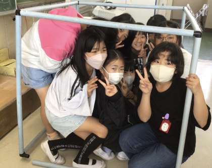 算数科「体積」の学習では、1立方メートルの大きさを予想しました。実際に立方体をつくり、何人入るかチャレンジしました。「次は教室の広さを調べたい」と、立方メートルに興味をもちました。