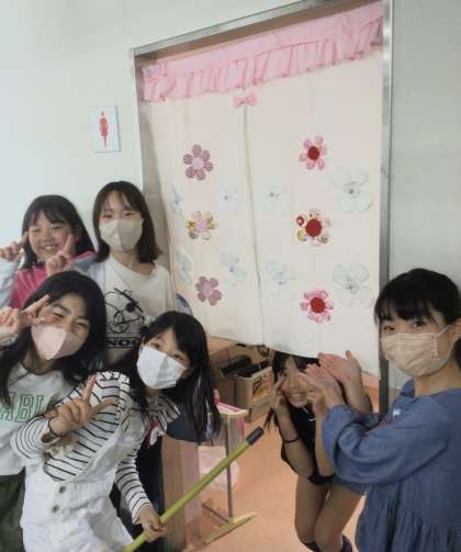 前小サポーターさんにいただいた新しいカーテンをトイレに設置しました。とても華やかになりました。