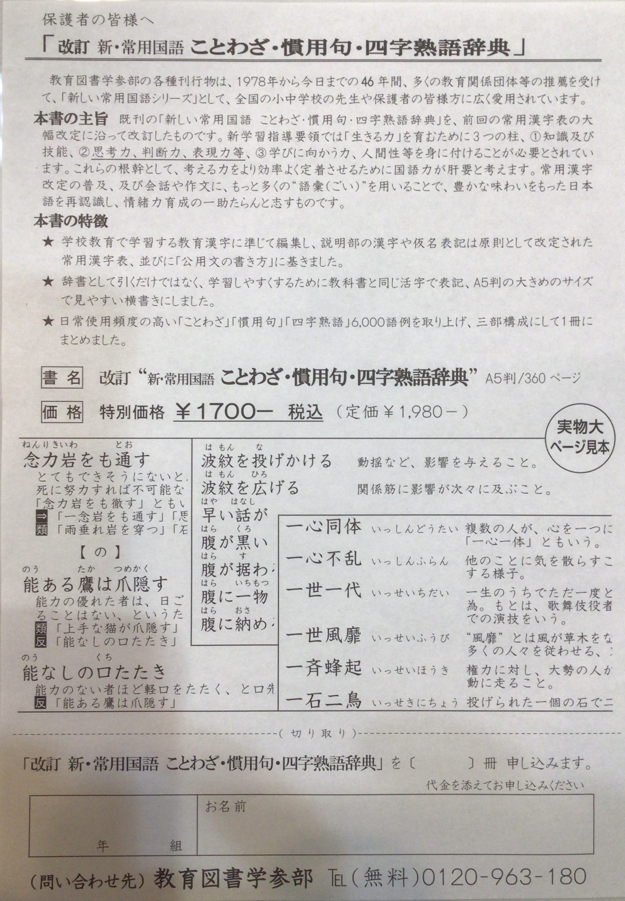 ホームページに、改訂「ことわざ・慣用句・四字熟語辞典」の販売のお知らせを掲載しました。購入を希望される方は、きずなネットの欠席連絡の連絡区分を「その他」にしていただき、欠席理由は入れずに連絡内容に「ことわざ辞典申込み用紙希望」と入力してください。担任を通じて申込み用紙をお渡ししますので、必要事項を記入し、5月23日(金)までに封筒に用紙と代金を入れて担任まで提出してください。