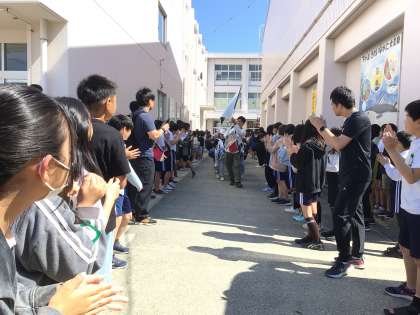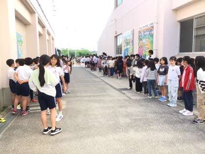 たくさんの児童がお見送りをしてくれました。窓には「いってらっしゃい」の文字もあり、温かい雰囲気で出掛けていきました。今頃、1日目の活動を満喫しているでしょうね。