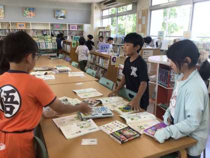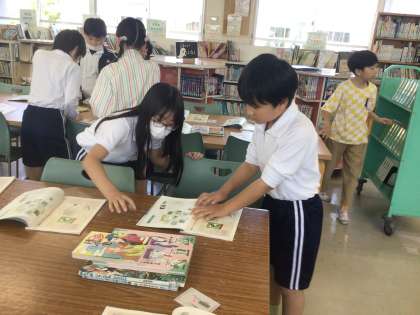 国語の授業で、学校図書館を使って、本の分類番号やラベルの勉強をしました。班になって分類番号ごとに本を選び、ミニ図書館を作りました。