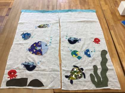 前サポさんが、トイレののれんを作ってくださいました。前回はパッチワークでしたが、今回は海の生物や花、リボンなど、とてもかわいらしい図案で子どもたちも大喜びでした。5年生のトイレに設置しました。ご来校の際はぜひご覧ください。