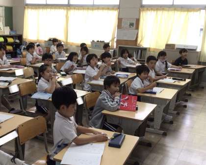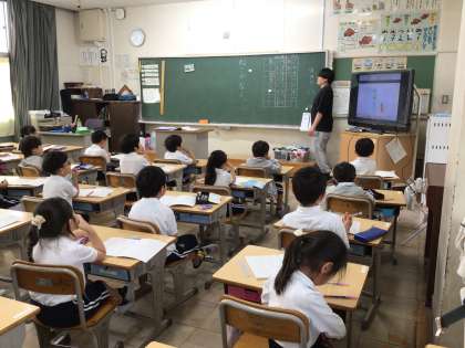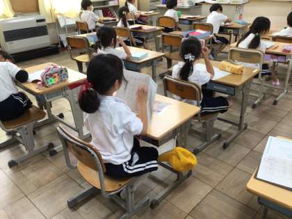 1年生の国語の授業の様子です。「文をつくろう」という単元で、「が」を使った文を考えてノートに書いていました。「ねこがなく」「ねこがはしる」「ねこがたべる」など、ねこを使った文が、ノートに丁寧に書かれていました。