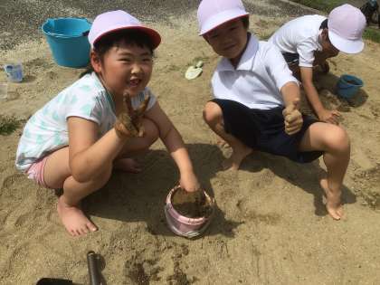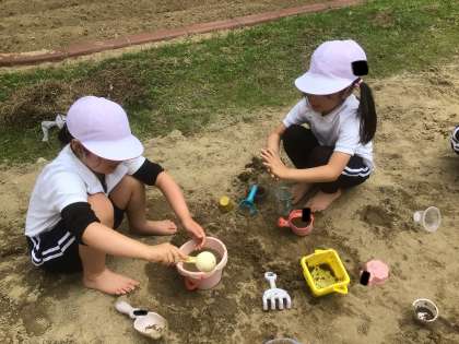 図画工作「すなやつちとなかよし」の単元では、砂や土で作りたいものを考え、形にしました。友達と協力して川や山を作ったり、持ってきた道具を使ってアイスや泥団子を作ったりと楽しそうな様子でした。終わりの時間が近づくと、まだやりたい!ととても意欲的でした。これからの図画工作でも、工夫して様々なものを作ったり描いたりできるといいですね。