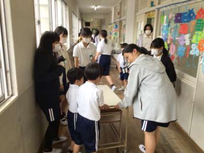 1年生の給食の片付けを手伝う様子です。お皿の片付けや、配膳台の片付け方などを優しく教えることができました。優しさを形にできる頼もしい6年生です。6月から始まる縦割り活動などでも、最高学年としての活躍を期待しています。