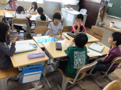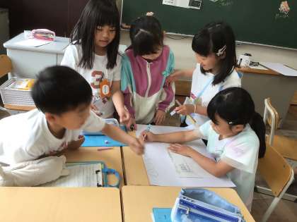 来週行われる学校探検に向けて、1年生のために一生懸命準備を進めています。今日はクラスを解体して、1・2組、3・4組合同でクイズ作りをしました。1年生に校内を案内しながら、教室について知ってもらうためのクイズです。写真は、それぞれのチームで頭を悩ませながら、どうしたら1年生が楽しめるか考えながらクイズを作っている様子です。