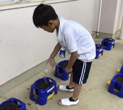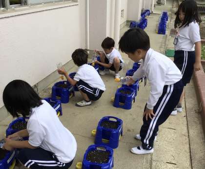 生活科の学習で、アサガオの種まきを行っています。鉢に土を入れたり、土に穴をあけて種を蒔いたり、楽しく活動しています。先週種まきをしたクラスのアサガオは、もう芽を出しました。今後、観察をしたり水やり等のお世話をしたりして、命を大切にする心を育みたいと思います。