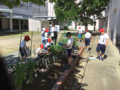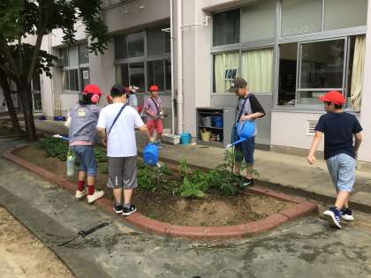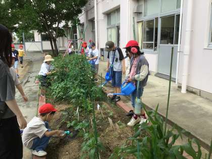 オアシスで栽培している夏野菜がぐんぐんと成長して、大きくなってきました。野菜の花が咲いたり、トマトの実ができたりなど、野菜の成長を喜んでいる子どもたちの姿が見られました。みんなで野菜を収穫するのが楽しみですね!