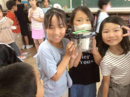 今週になって飼育していたアゲハのサナギが続々と羽化し始めました。サナギになってからだめになるケースが続いていたため、みんな大喜びでした。ベランダから飛び立つチョウに「さよなら〜」「ありがとう!」と声をかけていました。