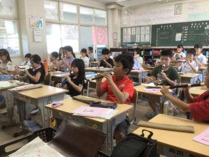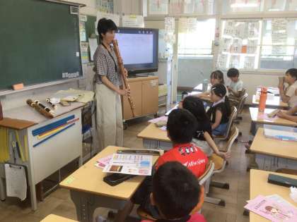 リコーダー講習会では、姿勢や吹く時の息の強さなどをしっかりと学びました。ソプラノリコーダー以外の大小様々なリコーダーの音に触れることもできました。講師の先生の演奏に全身ノリノリで歌う姿が楽しそうでした。