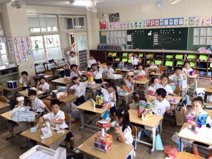 算数「いろいろなかたち」の単元で、形の特長を生かして動物を作りました。色々なアイデアが出て、たくさんの動物ができました。