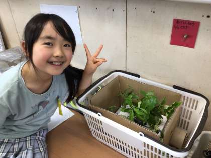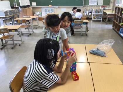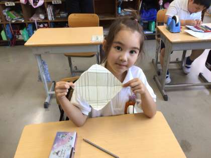 オアシスさんの教室に行くと、アゲハの幼虫やサナギがいて、成虫になるのを楽しみにして見守っている様子が見られました。先週の金曜日でしたので、もうそろそろ成虫になっているサナギもいたでしょうね。他のクラスでは、折り紙を細く折って、折り目に沿って模様を描いている児童もいました。とてもきれいな模様でした。